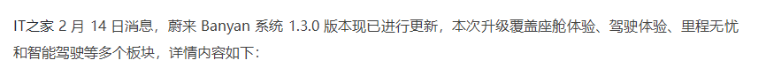 2 月 14 日消息,蔚來 Banyan 系統 1.3.0 版本現已進行更新,本次升級覆蓋座艙體驗、駕駛體驗、里程無憂和智能駕駛等多個板塊,詳情內容如下: