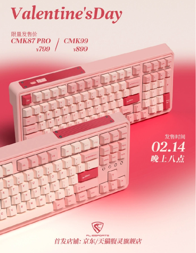 2 月 14 日消息,腹靈官方宣布,腹靈 xTTC 情人節限定鍵盤將在今晚 8 點正式開售,限定款 CMK87 Pro / CMK99.首發價 799 元起。其中 CMK87 Pro 售價 799 元,CMK99 售價 899 元。