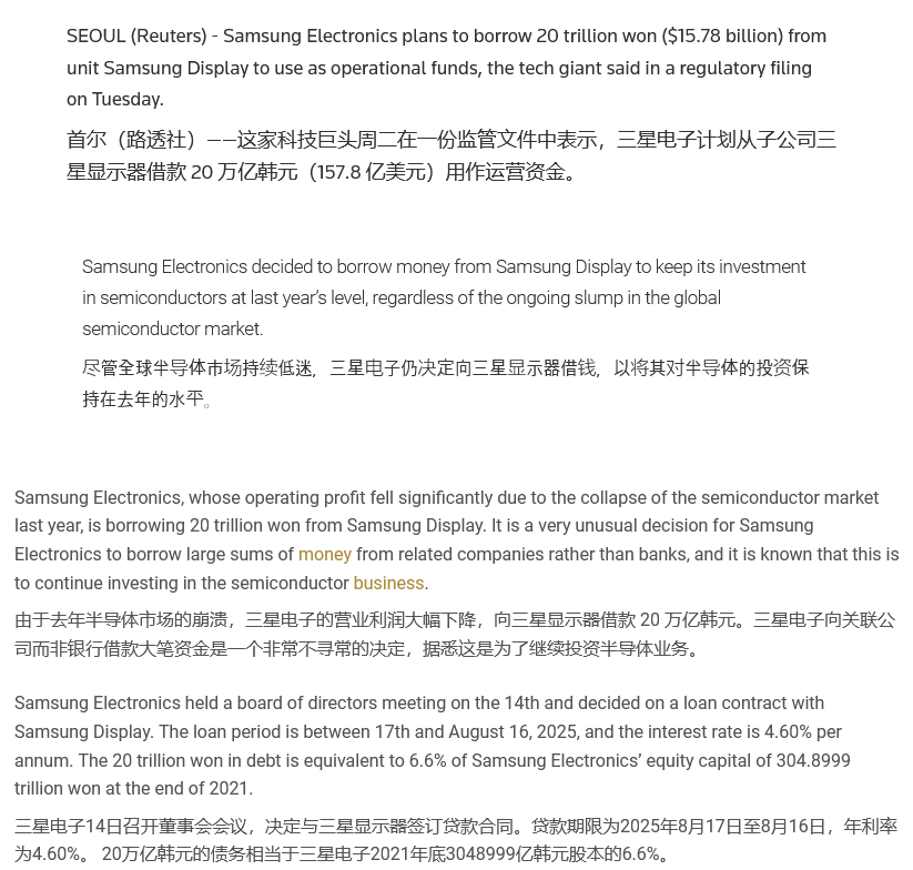 根據這份監管文件,三星電子計劃以 4.6% 的利率借入 20 億韓元,并計劃在 2025 年 8 月之前償還。文件中指出,三星電子希望通過借用這筆資金用作公司運營,支付包括員工工資在內的日常開支。