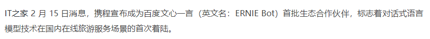 2 月 15 日消息,攜程宣布成為百度文心一言(英文名:ERNIE Bot)首批生態合作伙伴,標志著對話式語言模型技術在國內在線旅游服務場景的首次著陸。