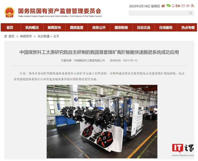 2 月 16 日消息,據國資委網站,中國煤炭科工太原研究院自主研制的我國首套煤礦高階智能快速掘進系統成功應用。