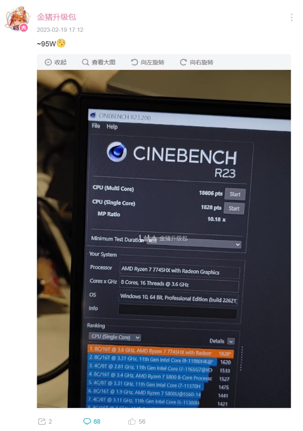 現在,AMD R7 7745HX(Zen4.8 核 16 線程)處理器的 Cinebench R23 跑分已經曝光。根據B站用戶 @金豬升級包 放出的圖片,R7 7745HX 在單核和多核工作負載中分別獲得 1828 和 18606 分。