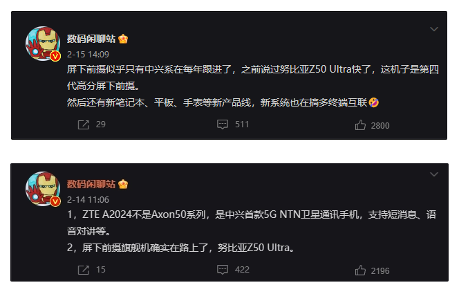 根據 @數碼閑聊站 的說法,該機將帶來中興系第四代高分辨率屏下攝像頭前攝,似乎是京東方方案。然后中興系列還將推出其他筆記本電腦、平板電腦、智能手表等產品。