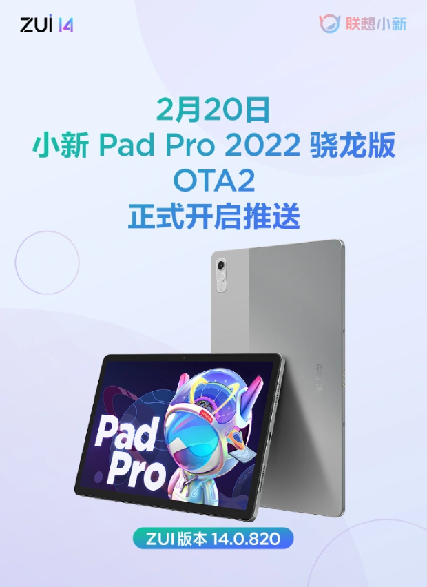 2 月 20 日消息,聯想小新 Pad Pro 2022 驍龍版今日正式開啟 ZUI 14.0.820 OTA2 推送。