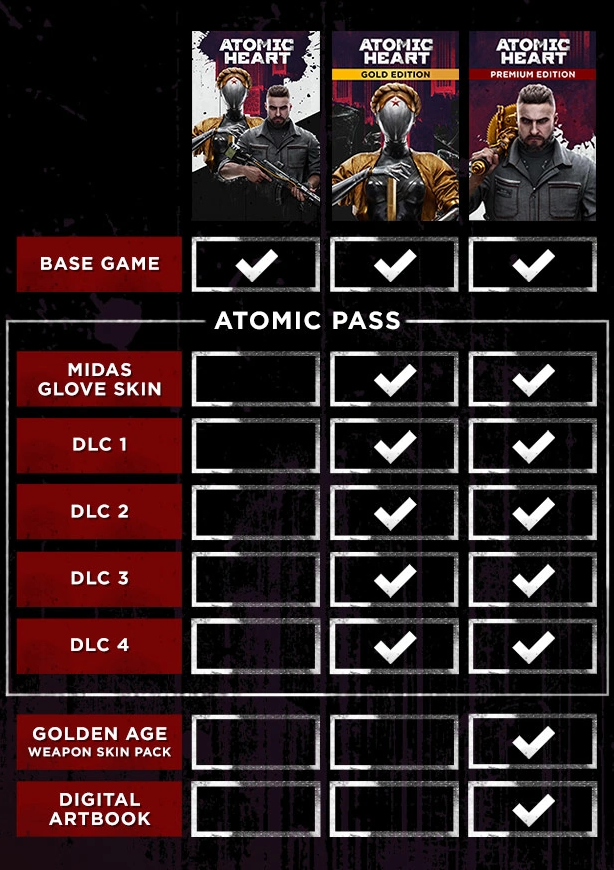 現可預購游戲并獲取 Labour & Science 武器皮膚包 的獨家預購獎勵。三個版本可供預購:標準版,基礎游戲;黃金版,除了游戲本體外還包括了原子通行證;高級版,內含黃金版內容、獨家數字版藝術書和額外的裝扮。原子通行證通過四個 DLC 進一步提升了《原子之心》的游戲體驗,開放了對新區域和實驗室的訪問以及新武器、新敵人、BOSS 和更多內容!