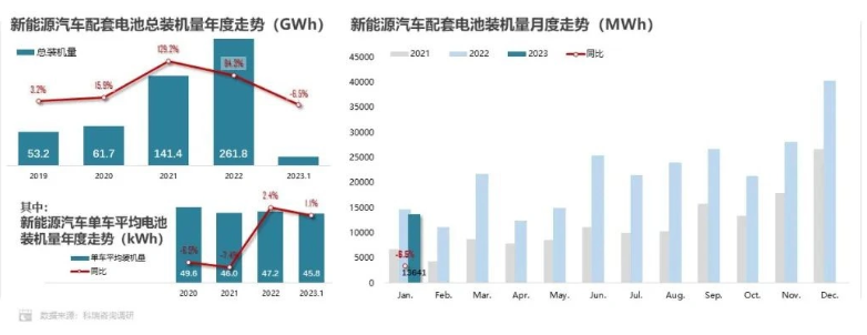 今年 1 月,新能源汽車動力電池裝機量 13.6GWh,同比下降 6.5%。新能源汽車動力電池裝機量較上月下降 26.6GWh。