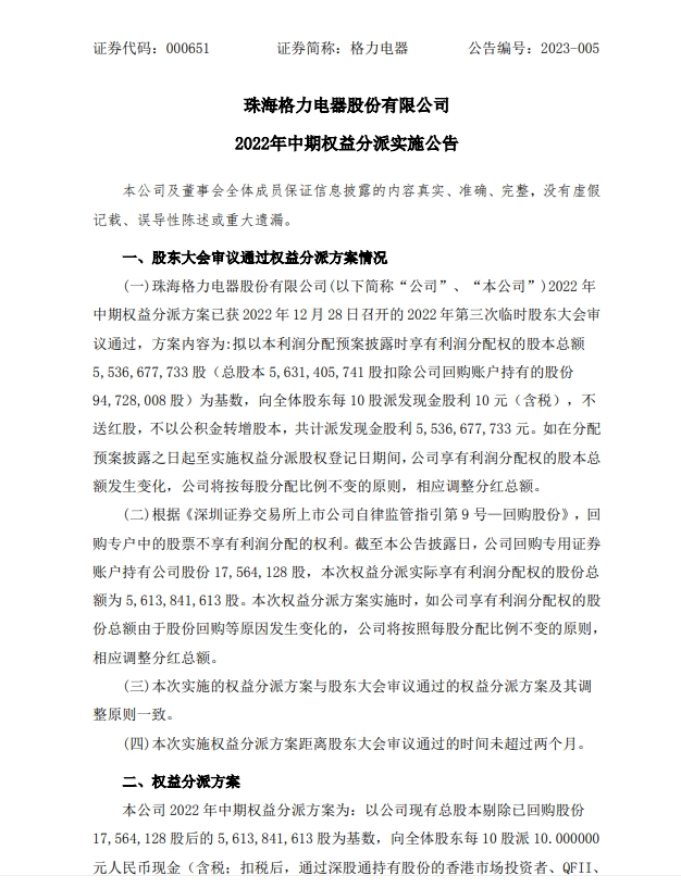 2 月 21 日消息,格力電器 2 月 20 日晚間公告,2022 年中期權(quán)益分派方案為,以公司現(xiàn)有總股本剔除已回購股份 1756.41 萬股后的 56.14 億股為基數(shù),向全體股東每 10 股派發(fā)現(xiàn)金股利 10 元(含稅),不送紅股,不以公積金轉(zhuǎn)增股本,共計派發(fā)現(xiàn)金股利 55.37 億元。股權(quán)登記日為 2023 年 2 月 24 日,除權(quán)除息日為 2023 年 2 月 27 日。