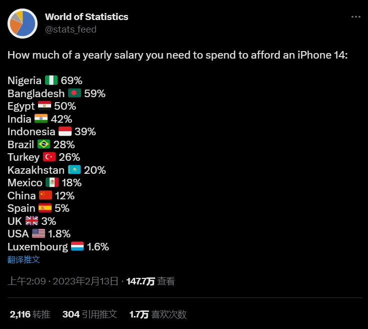 World Of Statistics 最新數(shù)據(jù)顯示,尼日利亞的消費者購買一部 iPhone 14 需要花費的年薪比例最高,為 69%,其次是孟加拉國(59%)和埃及(50%)。