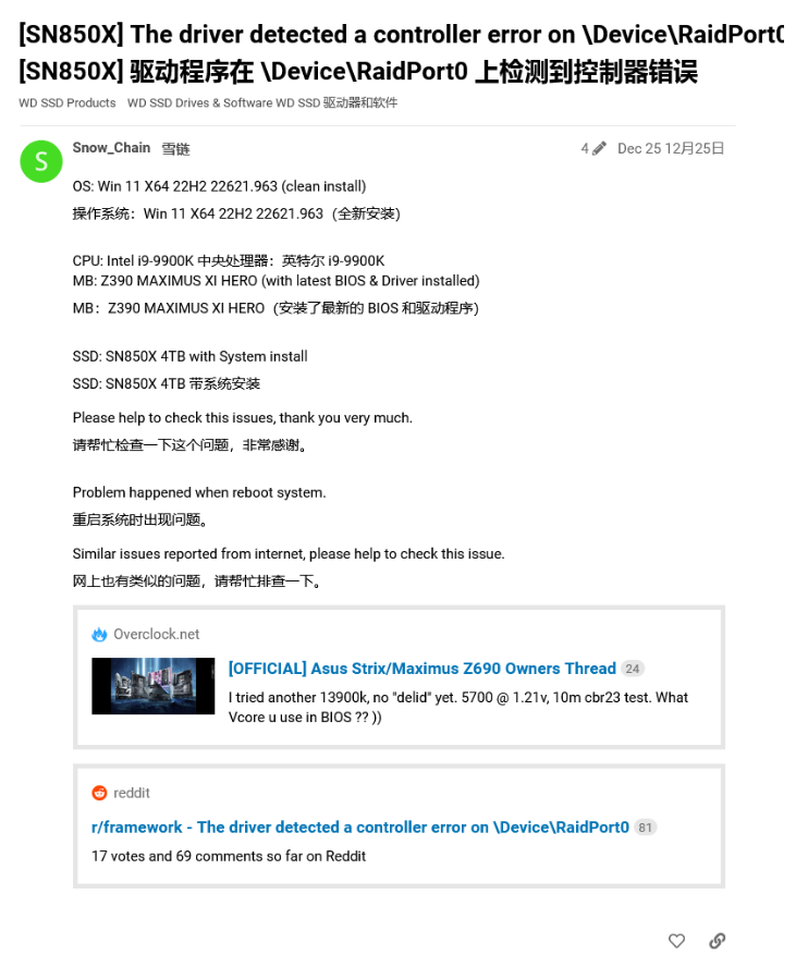 2 月 22 日消息,根據西部數據用戶反饋,SN850X SSD 安裝 Win11 22H2 功能更新之后,出現了卡死、藍屏死機等問題,用戶重啟電腦后會跳出“驅動程序在 \Device\RaidPort 上檢測到主控錯誤”。