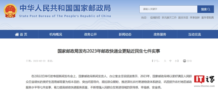 2 月 22 日消息,IT之家從國家郵政局網(wǎng)站獲悉,在今日舉行的專題新聞發(fā)布會上,國家郵政局新聞發(fā)言人、辦公室主任侯延波表示,2023 年,國家郵政局將推進深化農(nóng)村寄遞物流體系建設(shè)、鞏固提升農(nóng)村地區(qū)郵政服務(wù)水平等七件實事。具體為: