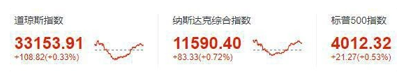 道瓊斯指數(shù)收于 33153.91 點(diǎn),漲幅 0.33%;標(biāo)準(zhǔn)普爾 500 指數(shù)收于 4012.32 點(diǎn),漲幅 0.53%;納斯達(dá)克指數(shù)收于 11590.40 點(diǎn),漲幅 0.72%。