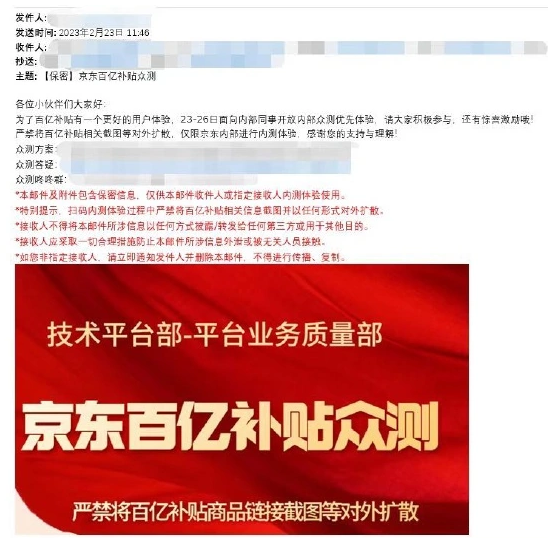郵件信息顯示,該郵件的發出時間是在 2 月 23 日中午,這意味著,目前京東已經開啟了“百億補貼”的內測工作。根據此前媒體爆料出的京東內部匯報方案,京東“百億補貼”將于 2 月 24 日完成競價系統上線。從此次郵件曝光的內測時間來看,該項目得到了提前。