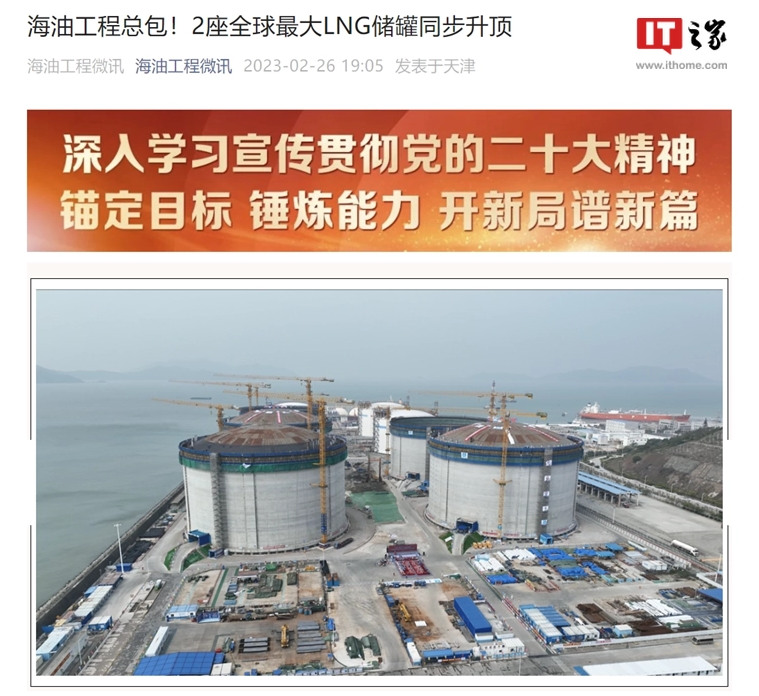 2 月 27 日消息,據海油工程官方消息,在海油工程總承包的金灣“綠能港”二期項目現場,兩座由我國自主設計建造的 27 萬立方米 LNG 儲罐于 2 月 25 日實現同步升頂,標志著儲罐主體結構已基本完成。