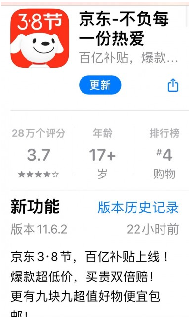 近期,有網(wǎng)友發(fā)現(xiàn),在最新版的京東APP11.6.2版本中,更新日志明確提到:“京東3.8節(jié),百億補(bǔ)貼上線”。