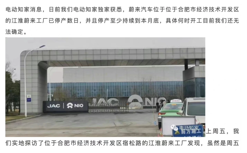 2 月 27 日消息,今日早間,有消息稱蔚來汽車位于合肥市經濟技術開發區的江淮蔚來工廠已停產數日,并且停產至少持續到本月底,具體何時開工目前還無法確定。