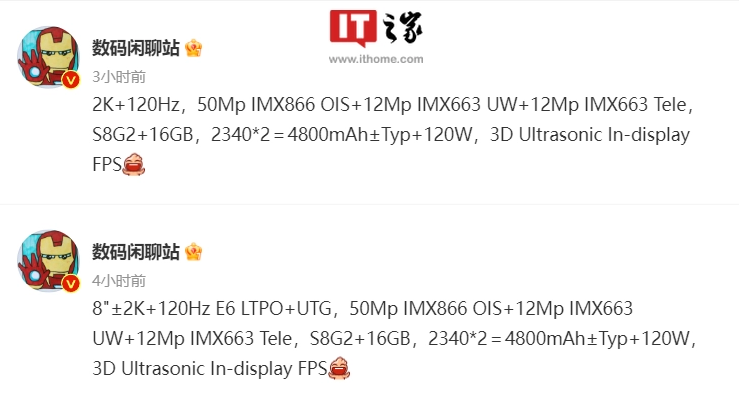據(jù)該博主爆料,vivo X Fold 2 采用 8 寸三星 E6 屏,2K 分辨率,支持 120Hz 高刷,以及 LTPO 動態(tài)高刷,支持 3D 超聲波屏下指紋。搭載第二代驍龍 8 處理器,內置 4800mAh 雙電芯電池,并且支持 120W 閃充,是首款支持百瓦閃充的二代驍龍 8 折疊屏手機。