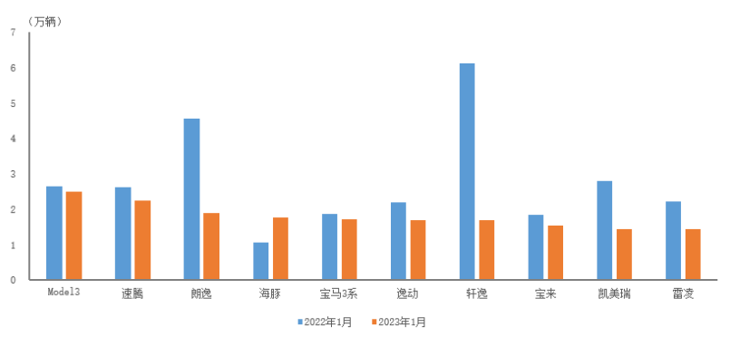 2 月 27 日消息,據中國汽車工業協會統計分析,2023 年 1 月,銷量排名前十位的轎車品牌依次為 Model 3、速騰、朗逸、海豚、寶馬 3 系、逸動、軒逸、寶來、凱美瑞和雷凌。