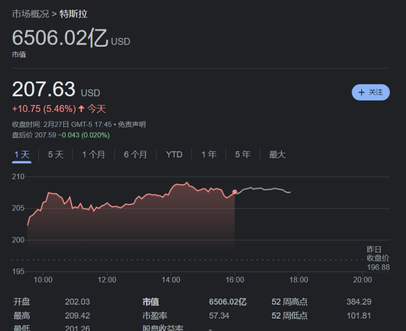 2 月 28 日消息,周一美股收盤,特斯拉股價大漲 5.46% 來到 207.63 美元每股,市值達到了 6506.02 億美元。也正因此,特斯拉 CEO 埃隆?馬斯克 (Elon Musk) 再次奪回了世界首富的寶座。