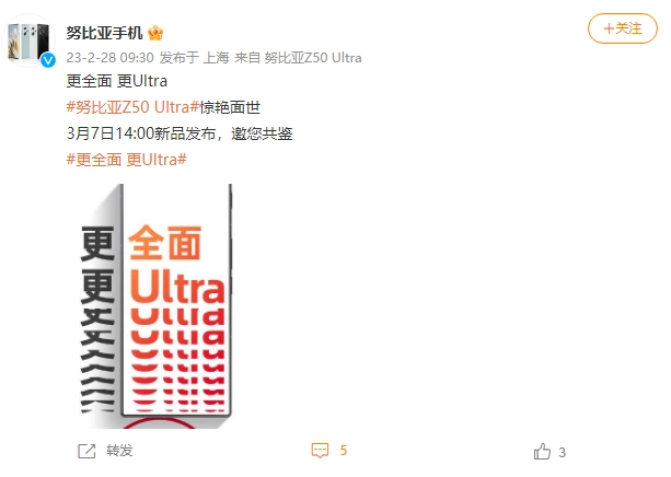 原標(biāo)題:努比亞 Z50 Ultra 手機(jī)官宣 3 月 7 日發(fā)布:更全面,更 Ultra