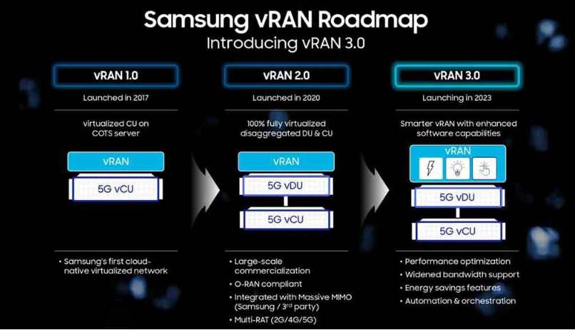 三星的 vRAN 3.0 具有先進的功能 / 特性,包括增加對大規模 MIMO 無線電的帶寬支持、分析每小時流量模式以優化網絡運行條件,以及使用“睡眠模式”(sleep mode)自動化網絡以節省能源消耗。