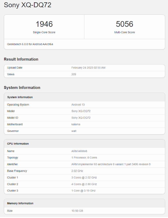 這個 GeekBench 跑分并未顯示內存容量翻倍,但 XQ-CQ72 信息顯示為 10.93GB,也就是說存在 12GB 版本的 Xperia 5 V。