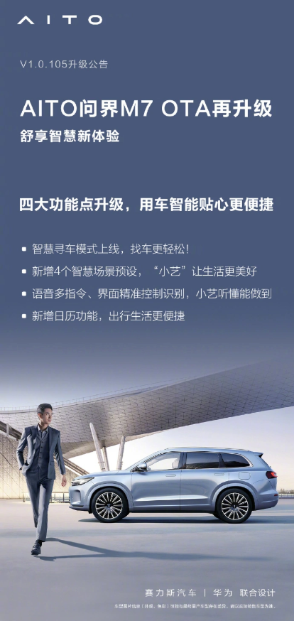 2 月 28 日消息,據華為余承東等宣布,AITO 問界 M7 汽車迎來了最新的 OTA V1.0.105 升級,鴻蒙智能座艙等帶來了 160 項功能優化,包括智慧尋車模式。這次升級后的問界 M7 可以自動識別并發送車位信息到 AITO App 里,讓大家找車更輕松。另外,智慧語音助手小藝更聰明了,就算一句話里有多達 5 個指令,它也能聽懂,還能幫用戶創建日程、查詢日程、提醒日程等。