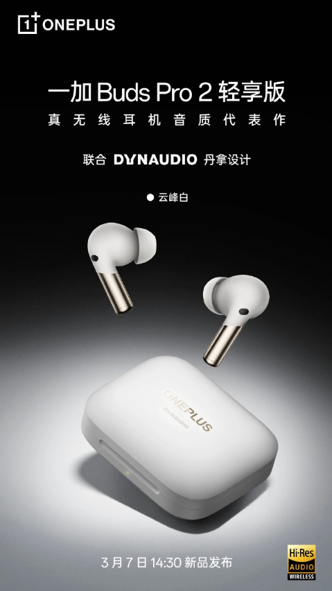 2 月 28 日消息,除了一加 Buds Pro 2 全新云峰白,一加還將帶來一加 Buds Pro 2 輕享版無線耳機的國行版,也擁有云峰白版本,將亮相 3 月 7 日新品發(fā)布會。