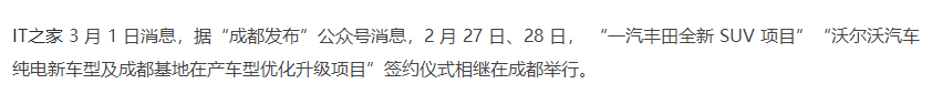 3 月 1 日消息,據“成都發布”公眾號消息,2 月 27 日、28 日, “一汽豐田全新 SUV 項目”“沃爾沃汽車純電新車型及成都基地在產車型優化升級項目”簽約儀式相繼在成都舉行。