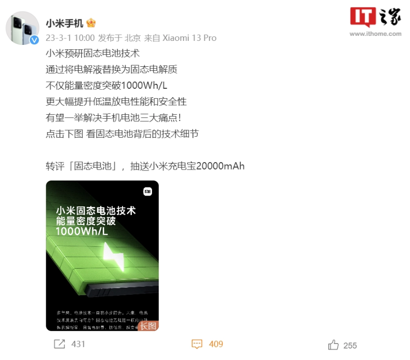 3 月 1 日消息,小米今日上午宣布預研固態電池技術,通過將電解液替換為固態電解質,不僅能量密度突破 1000Wh / L,更大幅提升低溫放電性能和安全性,稱“有望一舉解決手機電池三大痛點”。