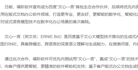 通過此次合作,福昕軟件可優(yōu)先內(nèi)測試用“文心一言”,集成“文心一言”的技術(shù)能力,在百度技術(shù)團(tuán)隊協(xié)助下通過“文心一言”對話式語言模式的賦能,向客戶提供更智能、更精準(zhǔn)的軟件幫助和支持;基于客戶版式辦公文檔生成智能摘要;文檔內(nèi)容智能搜索及給出修改建議……結(jié)合福昕版式文檔技術(shù)優(yōu)勢,以向客戶提供一站式、智能化、全生命周期的數(shù)字化辦公服務(wù),滿足用戶的進(jìn)階需求、強化產(chǎn)品競爭力,踐行“開發(fā)市場領(lǐng)先和創(chuàng)新性的PDF產(chǎn)品及服務(wù),幫助知識工作者在處理文檔時提高生產(chǎn)率并能做更多”的福昕使命!