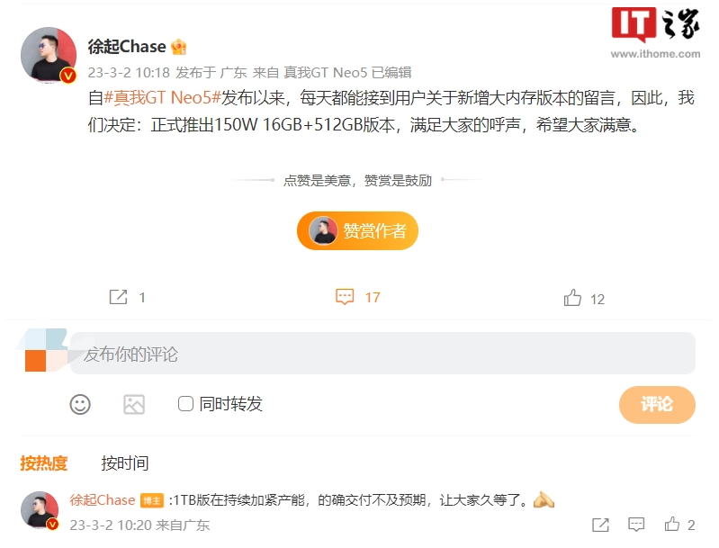 3 月 2 日消息,realme 副總裁徐起微博表示,自發布以來,每天都能接到用戶關于新增大內存版本的留言,因此決定:正式推出 150W 16GB+512GB 版本。另外,徐起還在評論中稱,1TB 版在持續加緊產能,的確交付不及預期。150W 16GB+512GB 版本目前還未在京東商城上架,價格暫未揭曉。