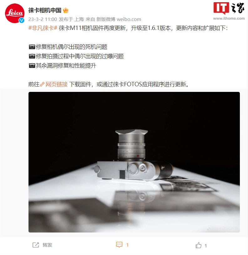 3 月 2 日消息,據徠卡中國發布,徠卡 M11 相機固件升級至 1.6.1 版本,本次更新修復相機偶爾出現的死機問題,修復拍攝過程中偶爾出現的過曝問題,其余漏洞修復和性能提升。