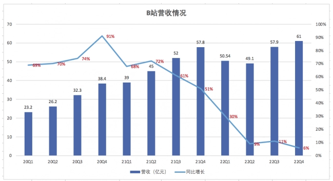 3 月 3 日消息,嗶哩嗶哩(下稱B站)交出 2022 年第四季度及全年成績單。2022 財年,B站營收同比增長 13% 至 219 億元,其中第四季度營收達 61.4 億元,同比增長 6%。