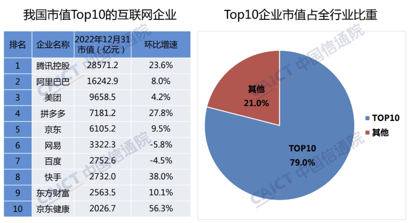 IT之家從中國信通院報告中發現,我國市值 TOP10 的互聯網企業分別是騰訊控股、阿里巴巴、美團、拼多多、京東、網易、百度、快手、東方財富、京東健康。