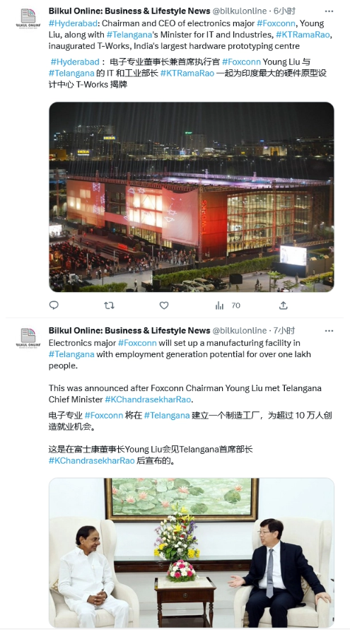 富士康董事長劉揚偉和特倫甘納邦首席部長 K Chandrasekhar Rao 會晤之后,雙方洽談之后達成協議。