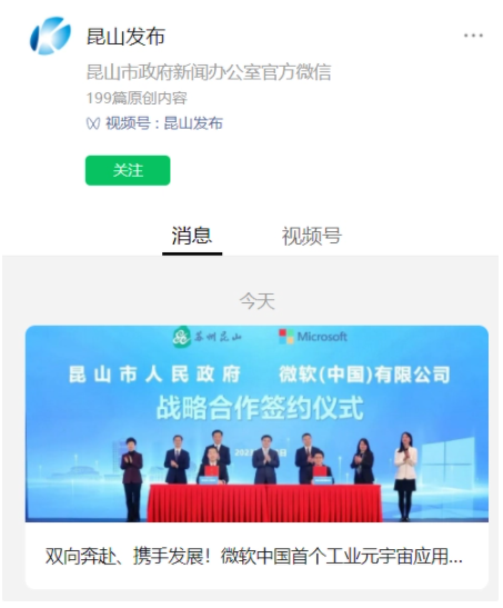 3 月 4 日消息,據昆山市政府新聞辦公室官方消息,3 月 3 日,昆山市人民政府與微軟(中國)有限公司簽署戰略合作協議,微軟中國首個工業元宇宙應用中心項目落戶昆山高新區。