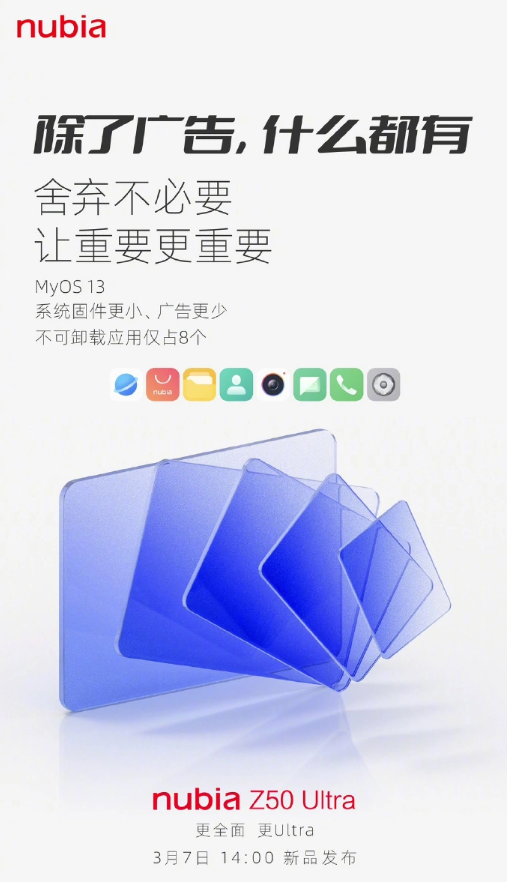 3 月 6 日消息,努比亞手機官方今日上午帶來努比亞 Z50 Ultra 手機的最新預熱信息,稱該機 MyOS 13 再次進階,系統固件更小,不可卸載應用僅占 8 個。