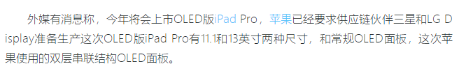 3月6日消息:外媒有消息稱,今年將會上市OLED版iPad Pro,蘋果已經要求供應鏈伙伴三星和LG Display準備生產這次OLED版iPad Pro有11.1和13英寸兩種尺寸,和常規OLED面板,這次蘋果使用的雙層串聯結構OLED面板。