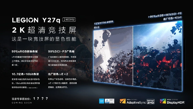從官方海報來看,拯救者 Y27q(240Hz)競技版顯示器支持 2K 分辨率,擁有 99% sRGB 標準色域與 90% DCI-P3 廣色域覆蓋。