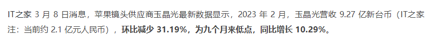 3 月 8 日消息,蘋果鏡頭供應商玉晶光最新數據顯示,2023 年 2 月,玉晶光營收 9.27 億新臺幣(IT之家注:當前約 2.1 億元人民幣),環比減少 31.19%,為九個月來低點,同比增長 10.29%。