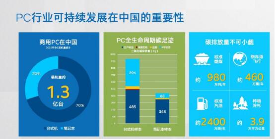 在很多人的認知里,降低碳排放的有效途徑僅僅是“使用清潔能源”,但實際上,碳排放存在于我們生產生活中的每個環節,拿數字經濟中無處不在的PC來說,其碳排放對綠色計算就是不可小覷的因素。根據2022年IDC裝機量統計,商用PC在中國裝機量達到1.3億臺左右,臺式機占比70%。根據平均4年的PC全生命周期碳排放量計算,相當于消耗約980萬噸標準燃煤或約2400萬噸標準汽油,或者飛機繞赤道飛行約460萬圈/年,如此多的碳排放需要種植約3.9萬平方公里的冷杉來抵消。