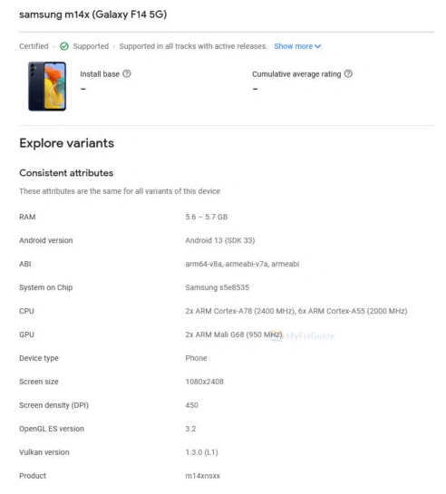 Galaxy F14 5G 被發(fā)現(xiàn)出現(xiàn)在 Google Play 管理中心網(wǎng)站,看起來像是重新命名的 Galaxy M14 5G,這款手機(jī)也是 Galaxy A14 5G 的略微修改版本。根據(jù)清單中的信息,Galaxy F14 5G 配備三星 Exynos 1330 處理器(IT之家注:S5E8535 采用兩個(gè) 2.4Ghz 大核搭配 2Ghz 小核,并搭配 Mali-G68 GPU)、6GB 內(nèi)存和 Android 13(One UI 5.0)。該設(shè)備似乎還配備了 Infinity-V 顯示屏,分辨率為 Full HD+。
