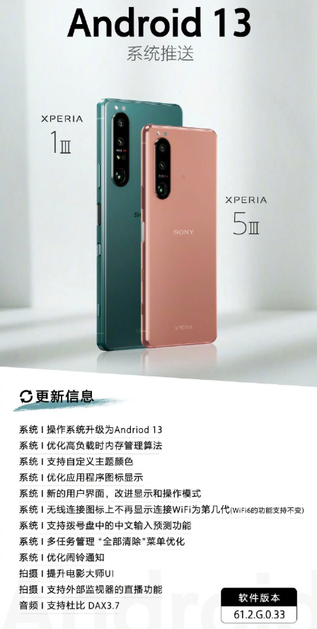 3 月 9 日消息,索尼宣布,三款 Xperia 機型推送 Android 13 系統,Xperia PRO-I 版本號為 61.2.H.0.25.Xperia 1 III 與 Xperia 5 III 版本號為 61.2.G.0.33.