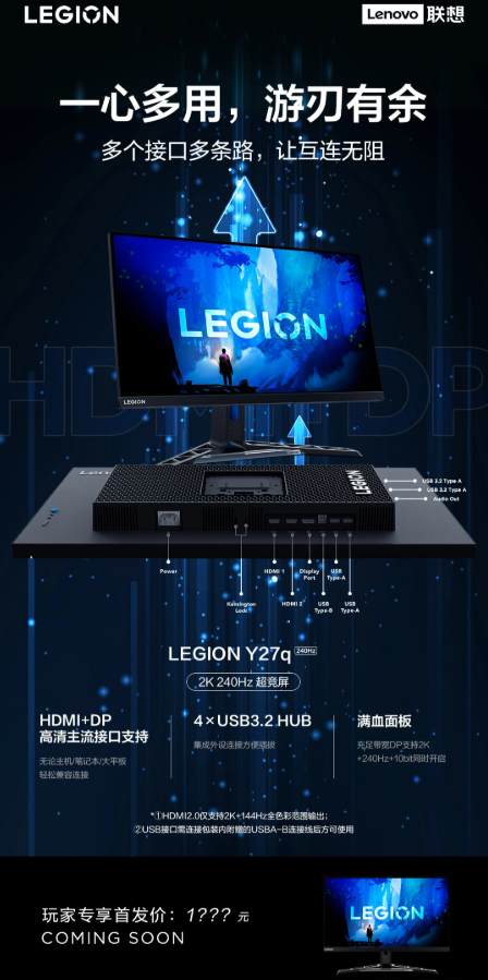 此外,從官方海報中“玩家專享首發價:1???”的字樣來看,拯救者 Y27q(240Hz)競技版顯示器首發價應該會在 1000 元至 2000 元之間。