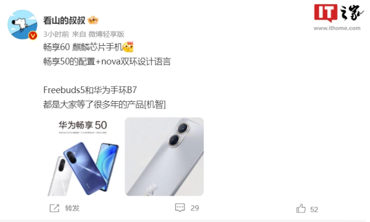 據微博博主 @看山的叔叔 爆料,華為暢享 60 手機將采用麒麟芯片,采用類似暢享 50 系列的配置,采用 nova 系列的雙環相機設計語言。