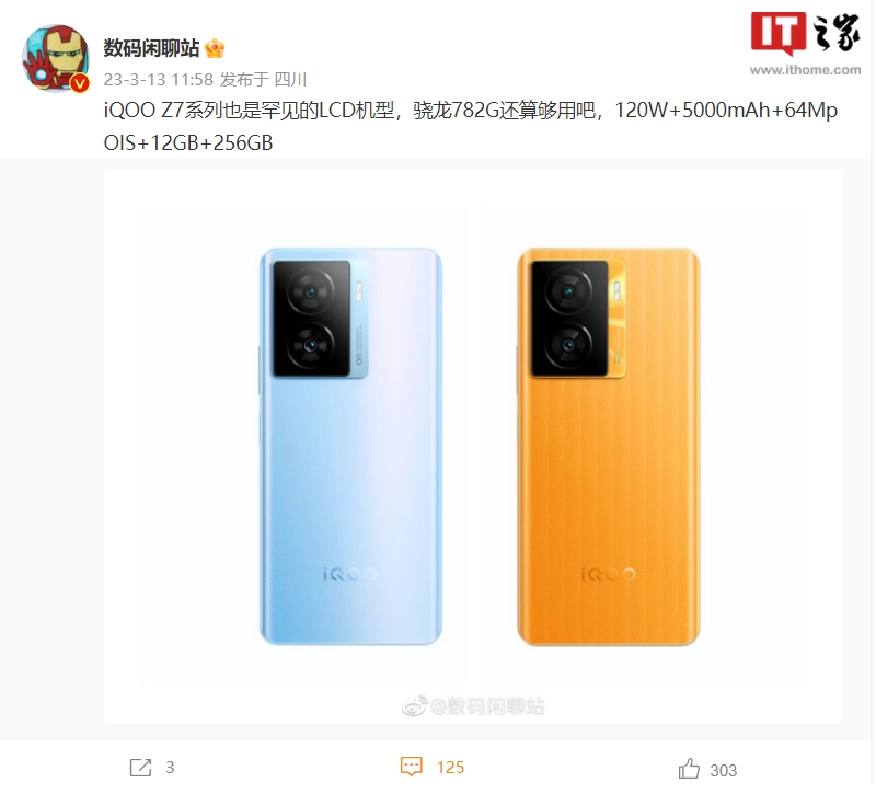 據微博博主 @數碼閑聊站 爆料,iQOO Z7 系列將是 LCD 機型,搭載驍龍 782G 芯片(IT之家注:上一代 iQOO Z6 搭載 778G + 芯片),支持 120W 快充,采用 5000mAh 電池,后置 64Mp OIS 光學防抖相機,擁有 12GB+256GB 存儲版本。