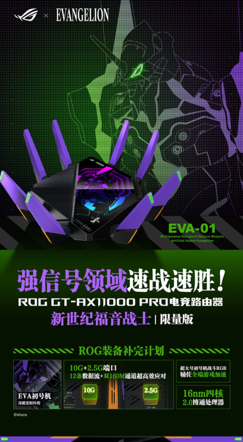 3 月 13 日消息,華碩去年與《新世紀福音戰士》聯名推出了 2999 元的限定款 ROG GT-RXБ000 路由器,現在又推出了一款聯名設計的 GT-AX11000 Pro 路由器,延續初號機配色,國行版本定價依然是 3499 元,將于今晚 24 點開售。