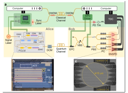 3 月 14 日消息,據中國科學技術大學官網,中國科學技術大學潘建偉、徐飛虎等與上海微系統所、濟南量子技術研究院、哈爾濱工業大學等單位的科研人員合作,通過發展高保真度集成光子學量子態調控、高計數率超導單光子探測等關鍵技術,首次在國際上實現百兆比特率的實時量子密鑰分發,實驗結果將此前的成碼率紀錄提升一個數量級。該成果于 3 月 14 日在線發表于國際學術期刊《自然-光子學》(Nature Photonics)。