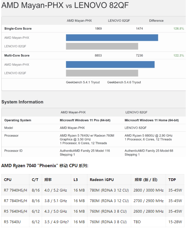 原標題:AMD 銳龍 5 7640U“Phoenix”6 核筆記本電腦 CPU 跑分曝光,比 6600U 快 60%