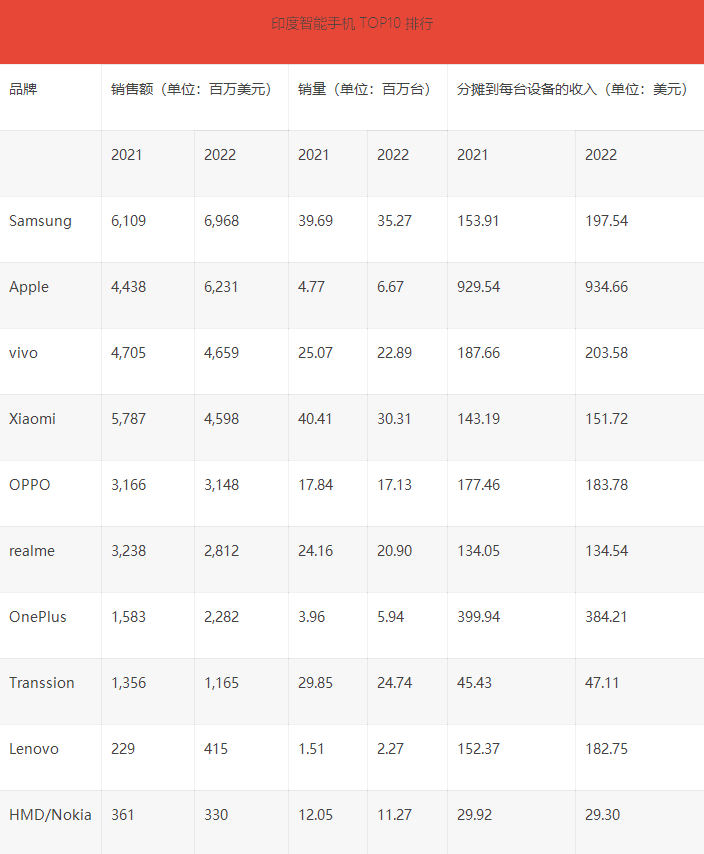 三星 2022 年在印度市場的智能手機銷售額為 69 億美元,同比增長 14.07%